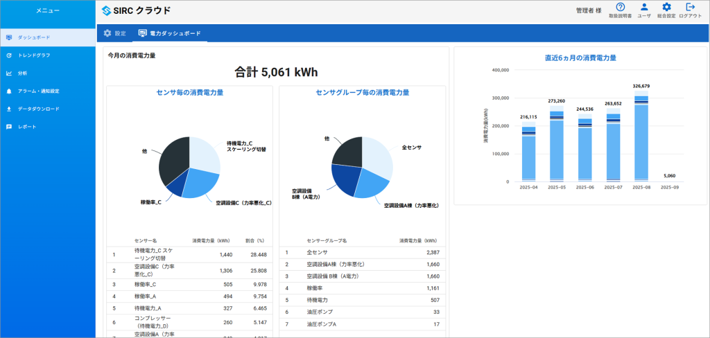 月間の総消費電力量や設備ごとの内訳を一目で確認できます。直近6か月の推移がグラフ化されるため、消費傾向を簡単に把握でき、季節による変動や稼働状況の変化も見逃しません。