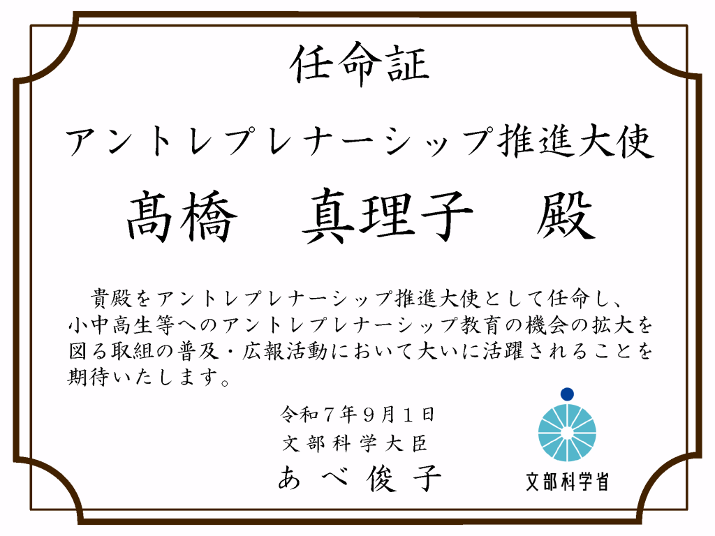 このたび、当社代表取締役CEOの髙橋真理子が、文部科学省の「アントレプレナーシップ推進大使」に任命されました。